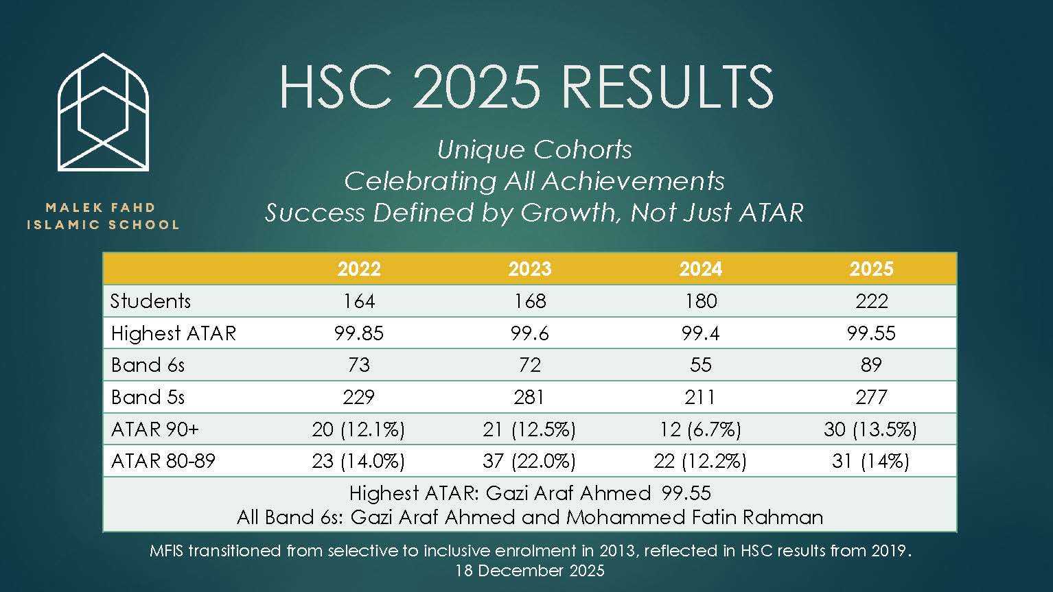 Since 2013, Malek Fahd Islamic School has no longer exclusively enrolled academically high-performing students, which reflected in the HSC results since 2019. Instead, enrolment preference has been given to siblings and to children of staff and alumni. Despite this shift, our students continue to excel, demonstrating the strength of our learning environment and the comprehensive support provided to every learner.