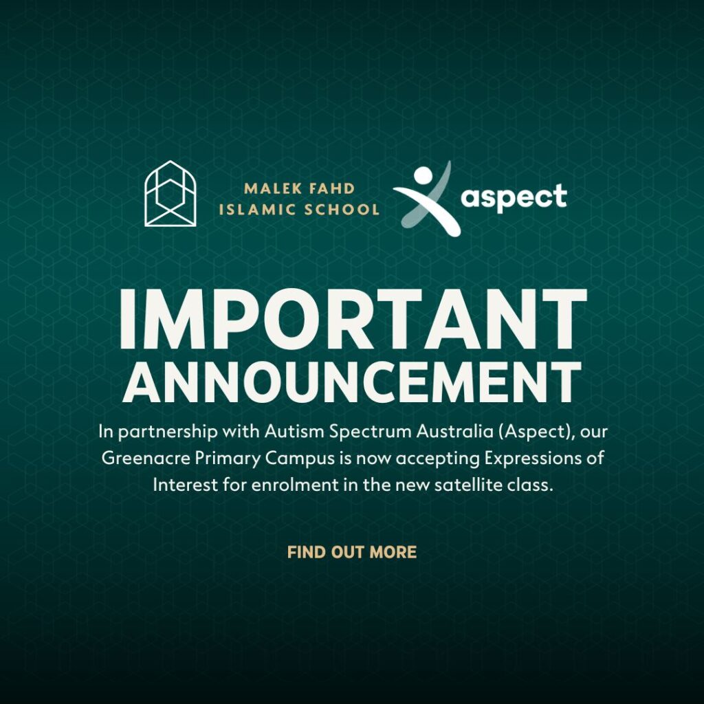 Malek Fahd Islamic School is pleased to share an important development for our community. In partnership with Aspect – Autism Spectrum Australia (Aspect), our Greenacre Primary Campus is in the process of establishing Aspect Satellite Classes, planned to commence in Term 2, 2026 (pending final compliance approvals and facility upgrades), inshā’Allāh.